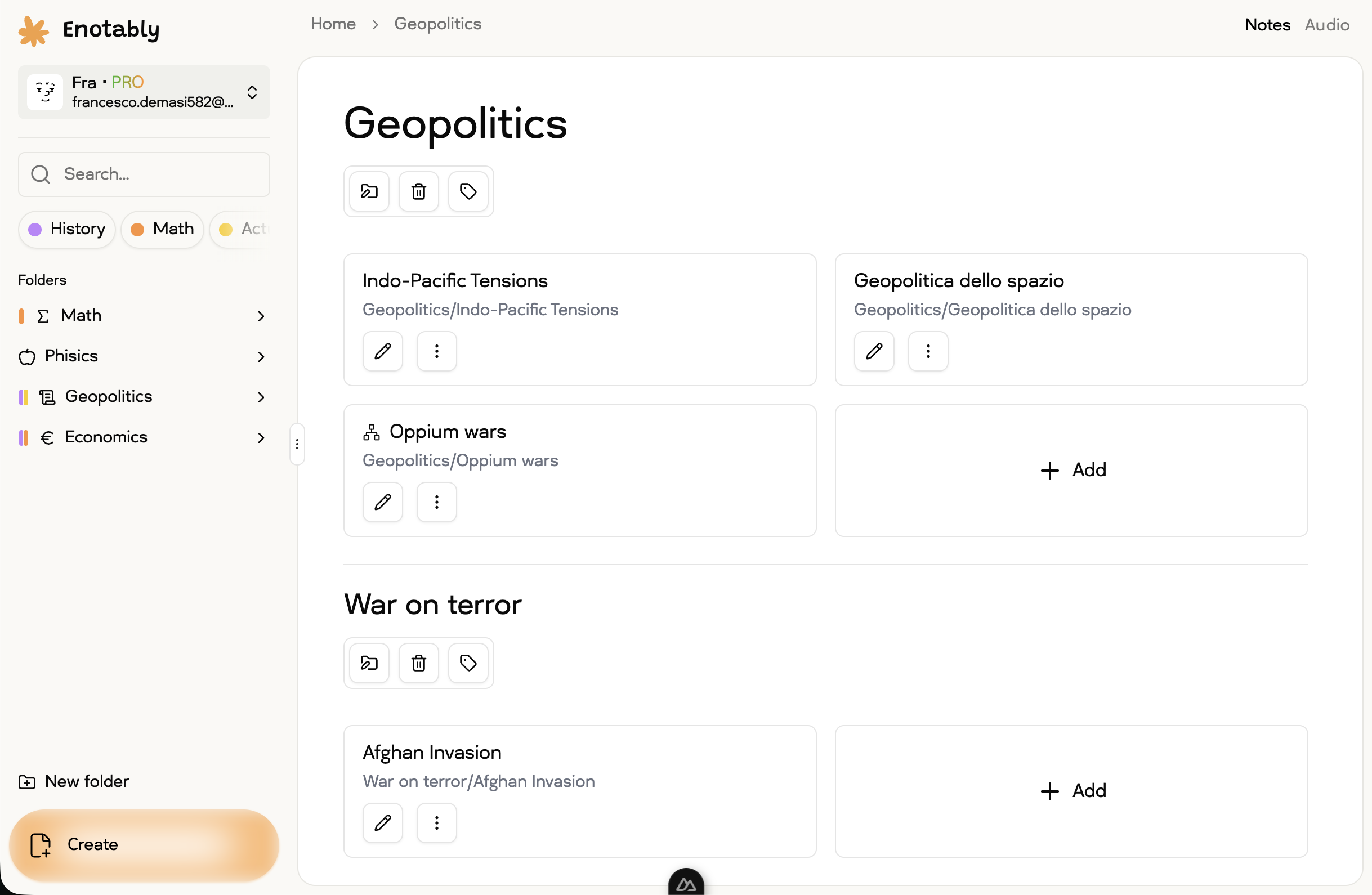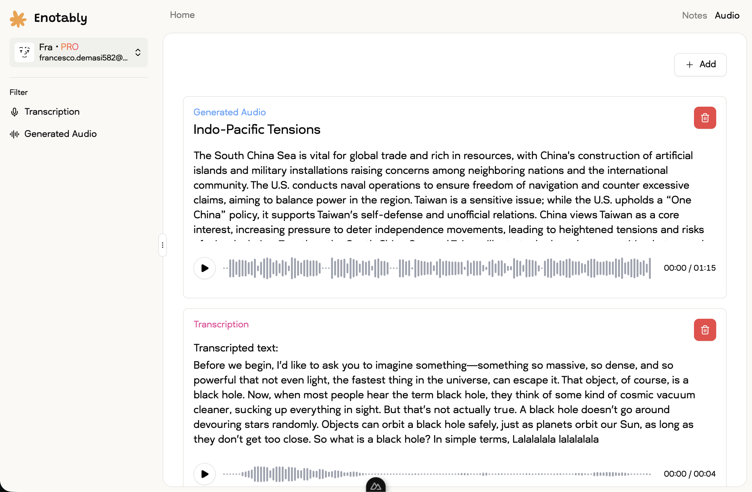 Upload PDFs, audio, or videos. Enotably transcribes and organizes everything into a single, searchable note.